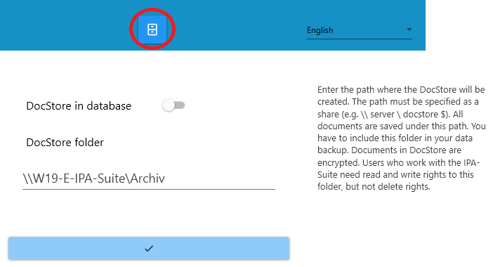 Geben Sie in diesem Fenster den Pfad an, an den der DocStore angelegt werden soll. Der Pfad muss als Freigabe angegeben werden (z.B. \serverdocstore$). Alle Dokumente werden unter diesem Pfad gespeichert. Sie müssen diesen Ordner in Ihr Datenbackup einbinden. Dokumente im DocStore sind verschlüsselt. Benutzer die mit der IPA-Suite arbeiten benötigen Lese- und Schreibrechte in diesem Ordner, nicht jedoch Löschrechte.
