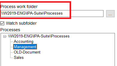 - Der ‚vom Prozess überwachte Ordner‘ (Process watched folder) muss ein UNC Pfad <<\ServerFreigabeOrdner>> sein.