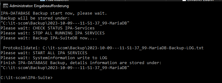 Gehen sie dann in das Verzeichnis C:it-scomipa-suite führen sie in dem DOS Fenster den folgenden Befehl aus: IPA-SuiteDB-Backup.cmd